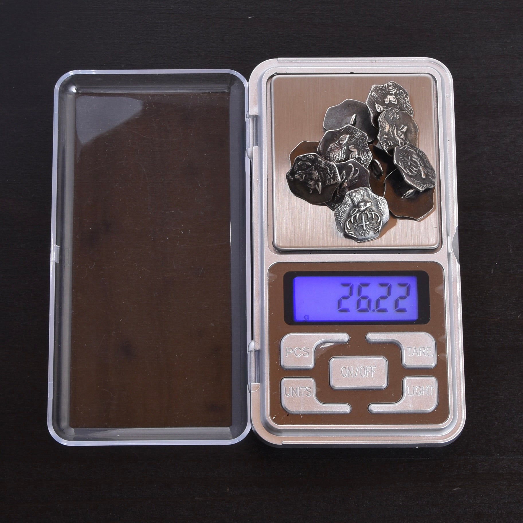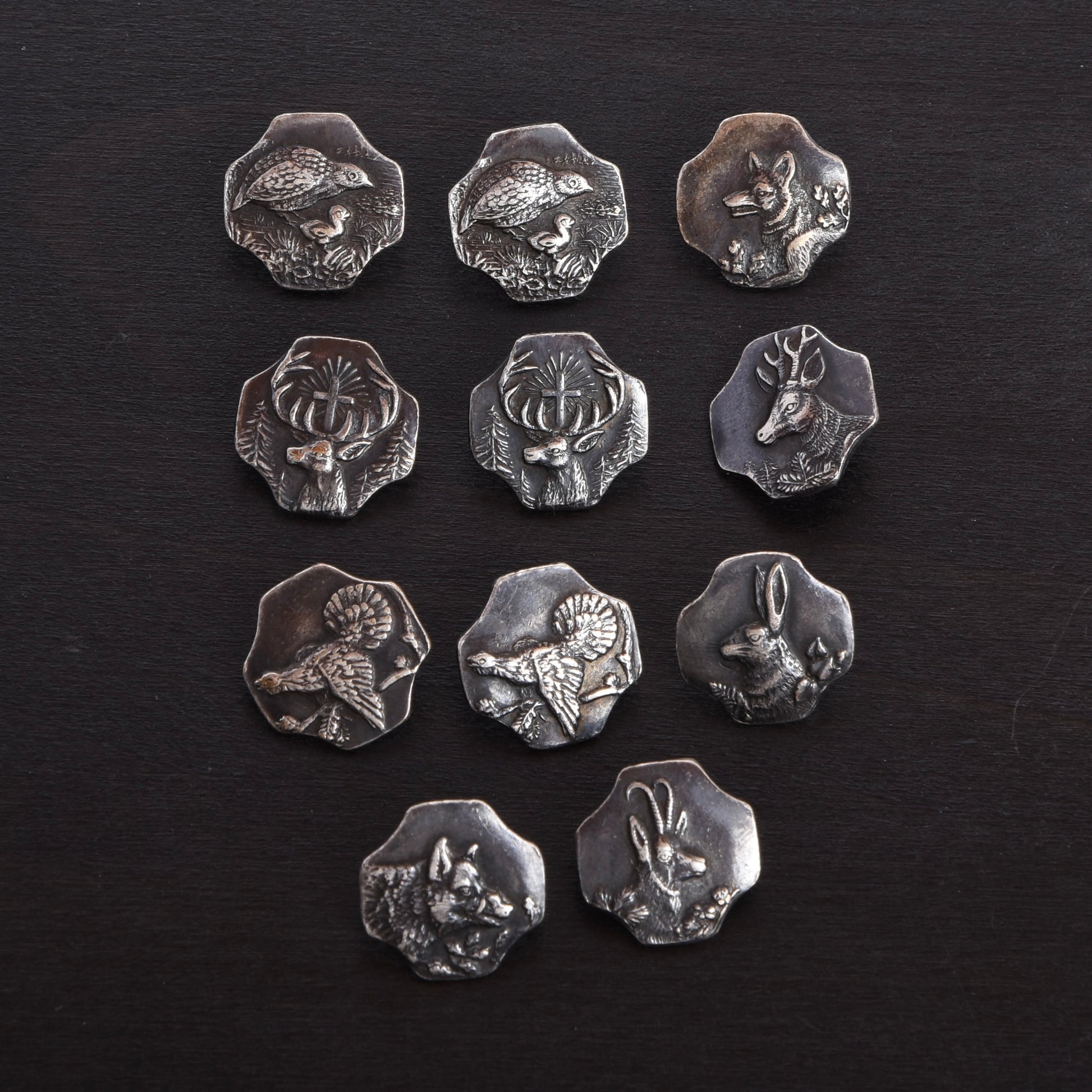 Set of 11 .800 silver hunting-themed buttons. Total weight of set is ca. 26.22g.