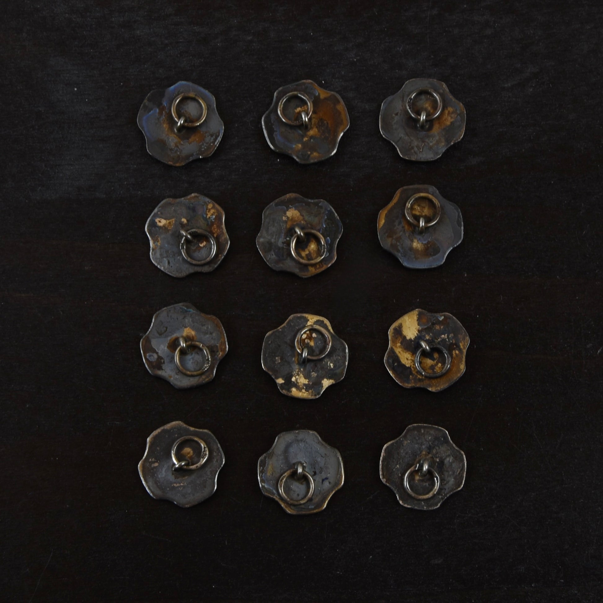 Set of 12 .800 large silver buttons. Total weight of set is ca. 26.69g.