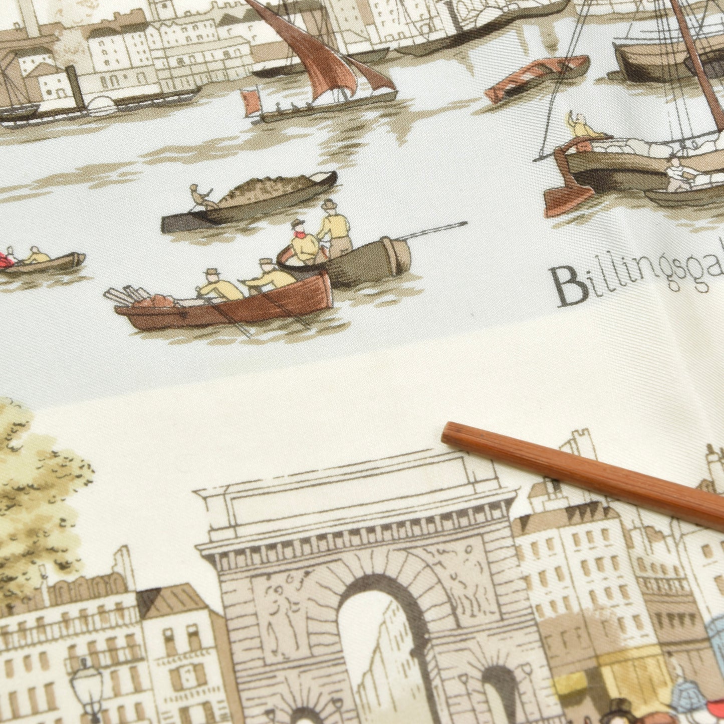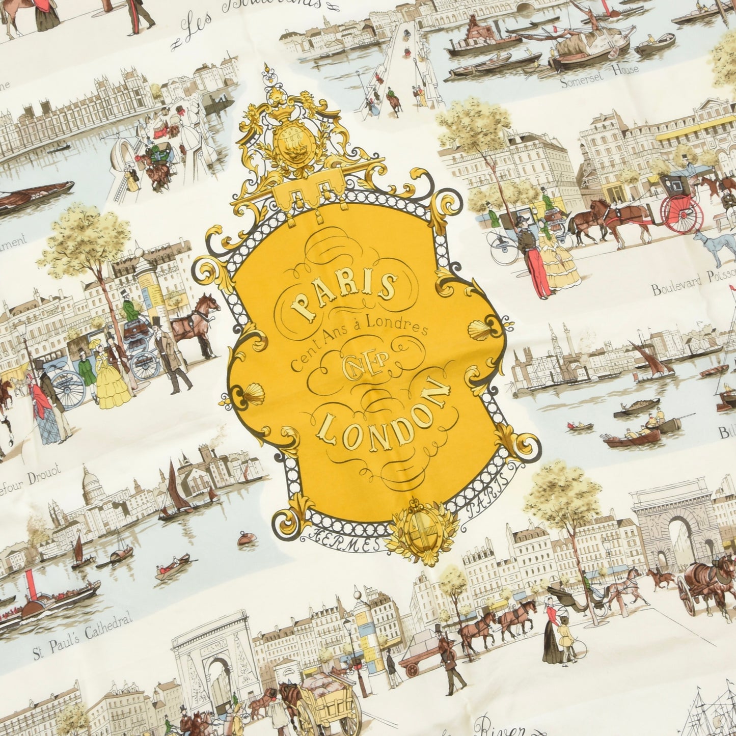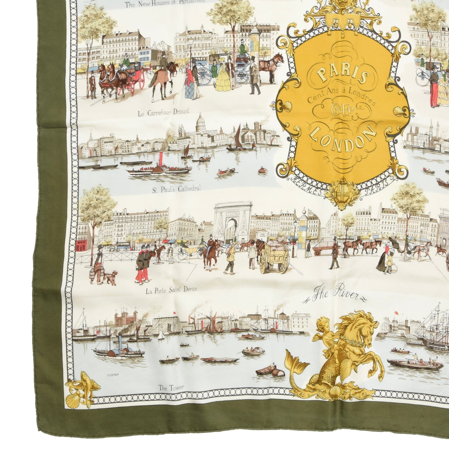 Silk scarf by Hermès Paris titled London-Paris 1850 by Philippe Ledoux. Made in France of 100% silk. Rare scarf print.