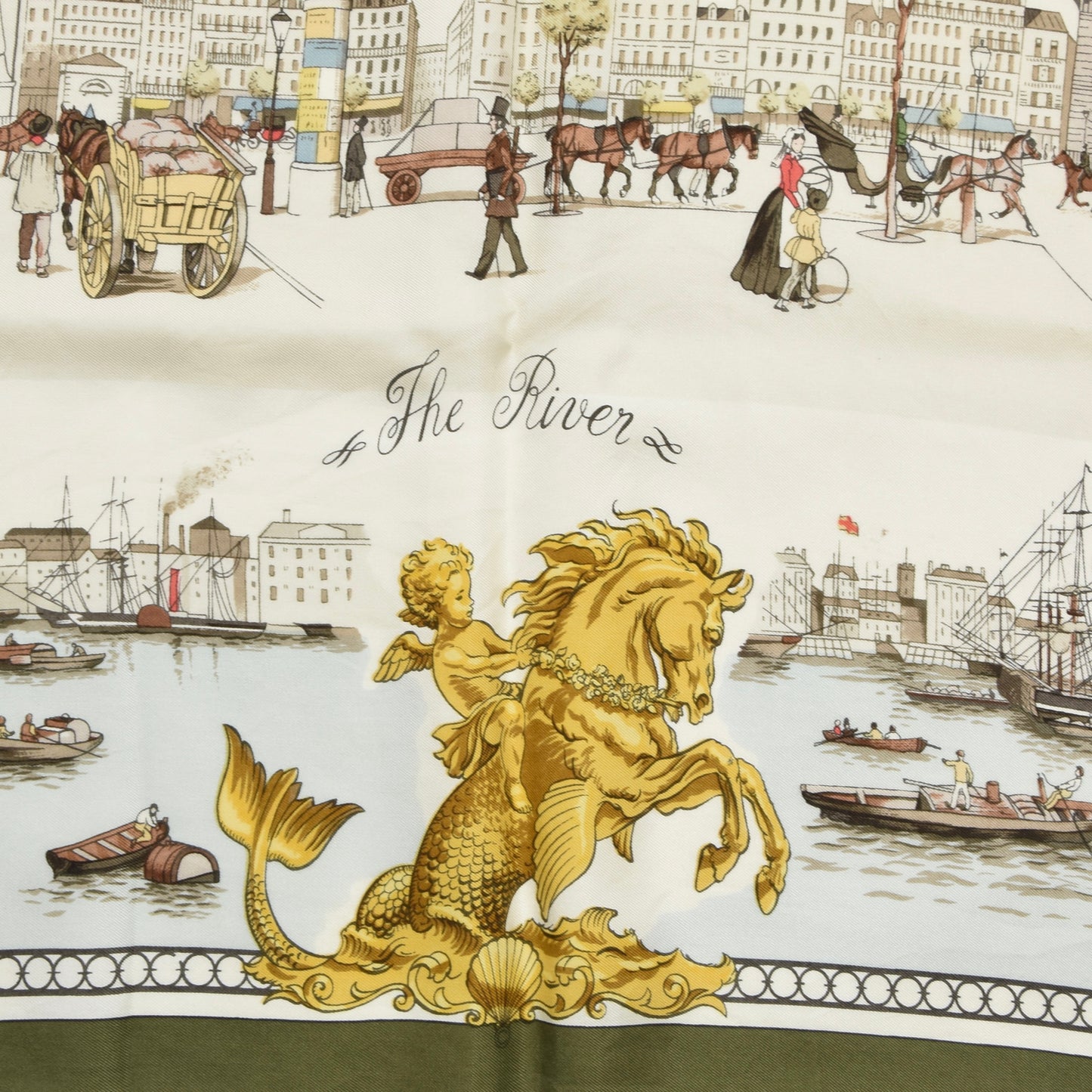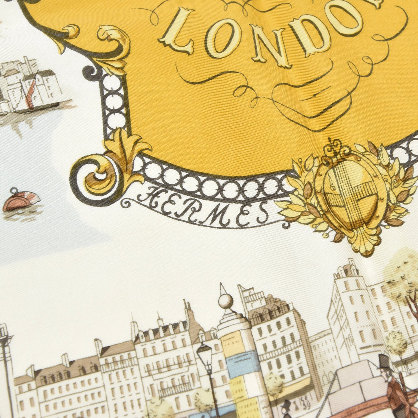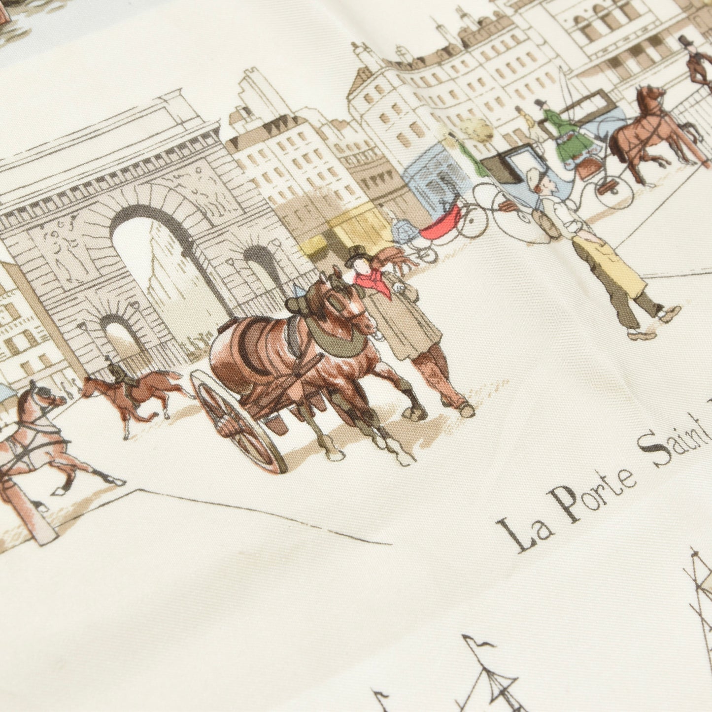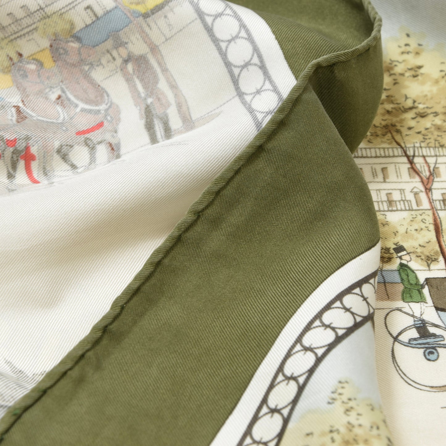 Silk scarf by Hermès Paris titled London-Paris 1850 by Philippe Ledoux. Made in France of 100% silk. Rare scarf print.