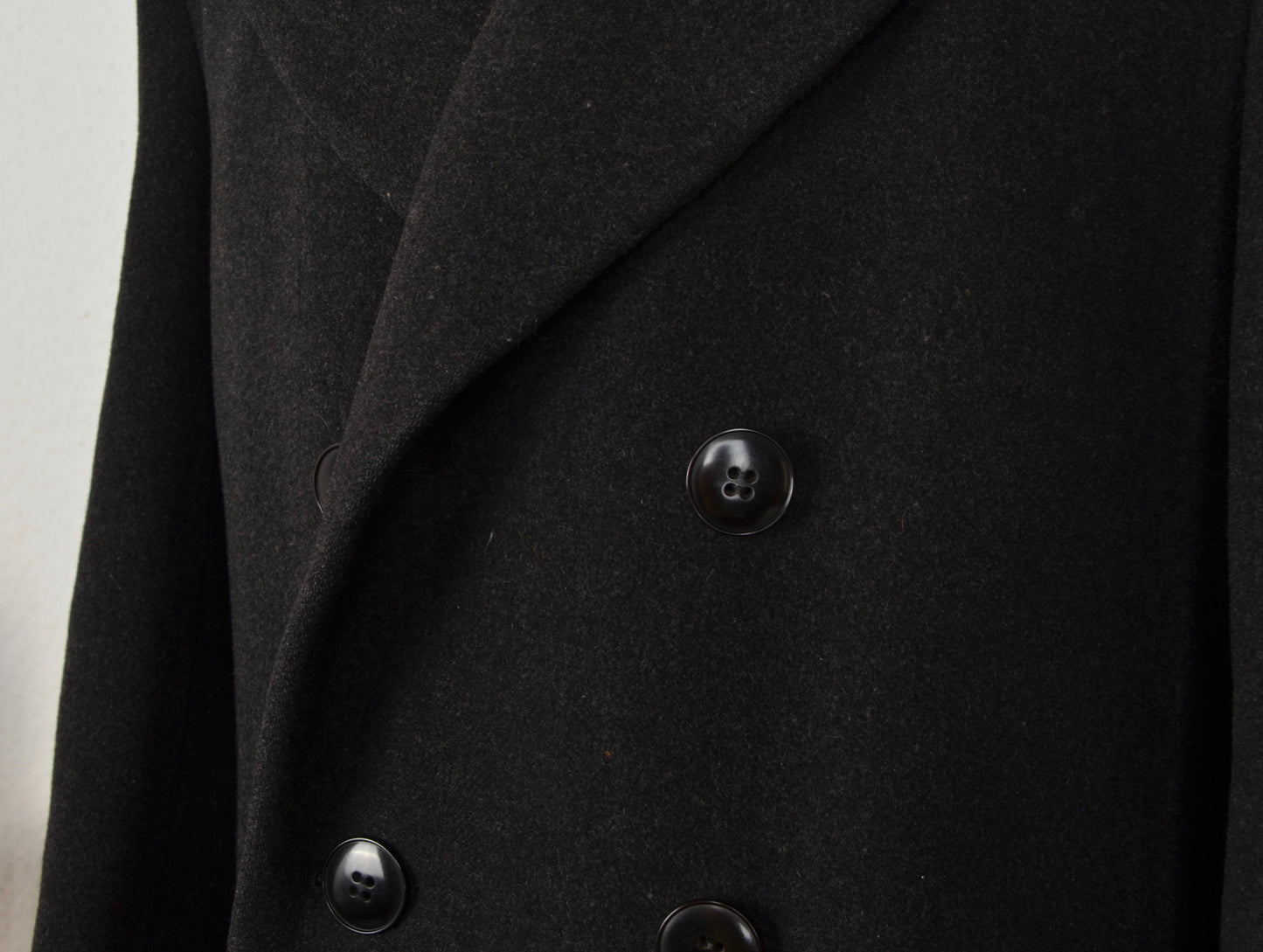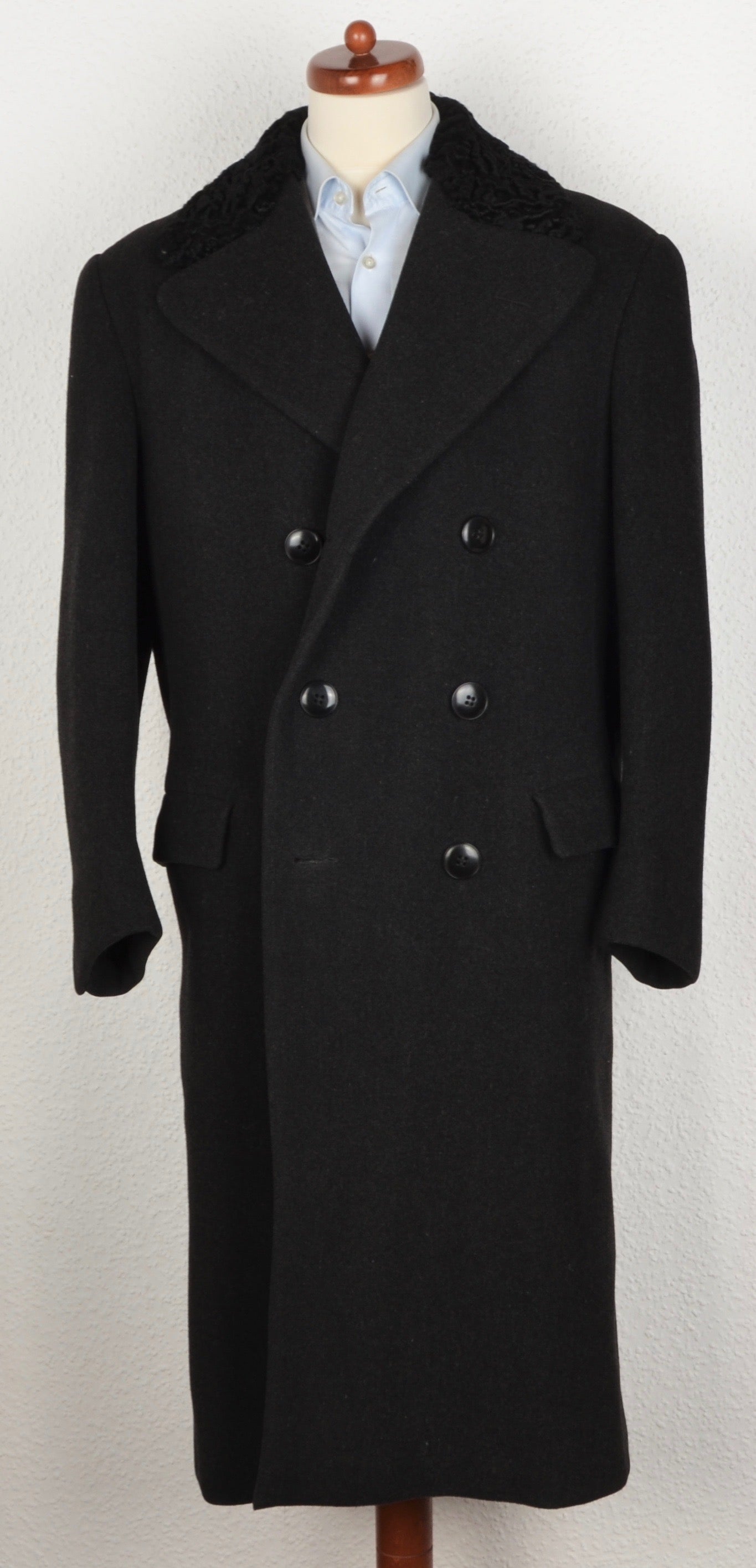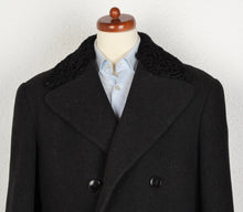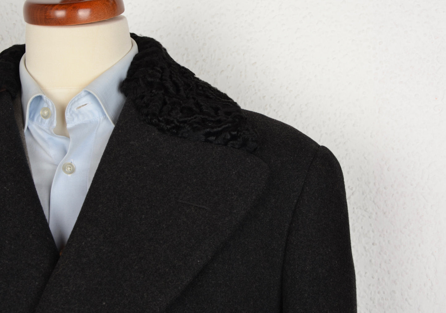Maßgeschneiderter zweireihiger Mantel von 1940. Anthrazitgrauer Mantel mit schwarzem Astrakan-Kragen. Hergestellt in Österreich.