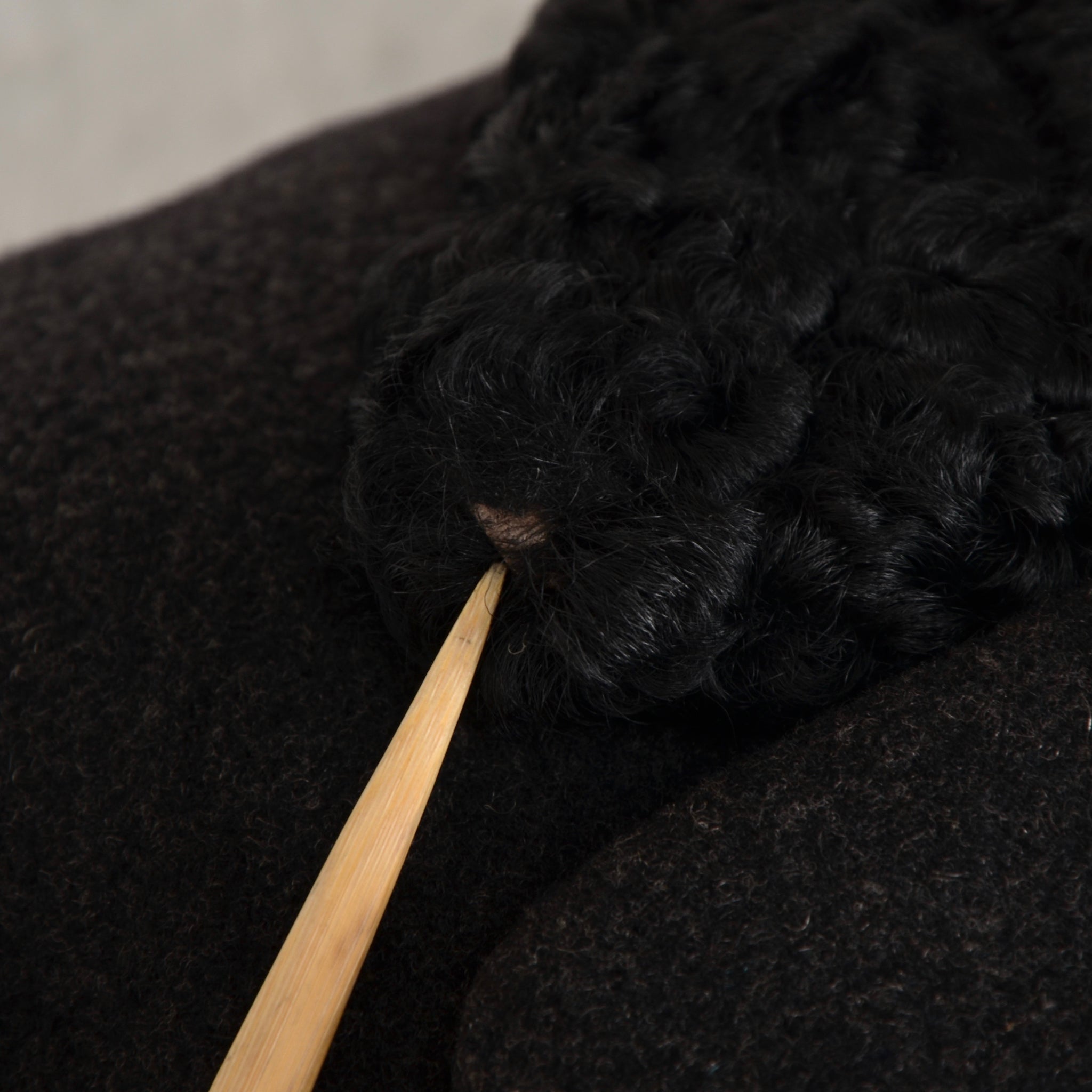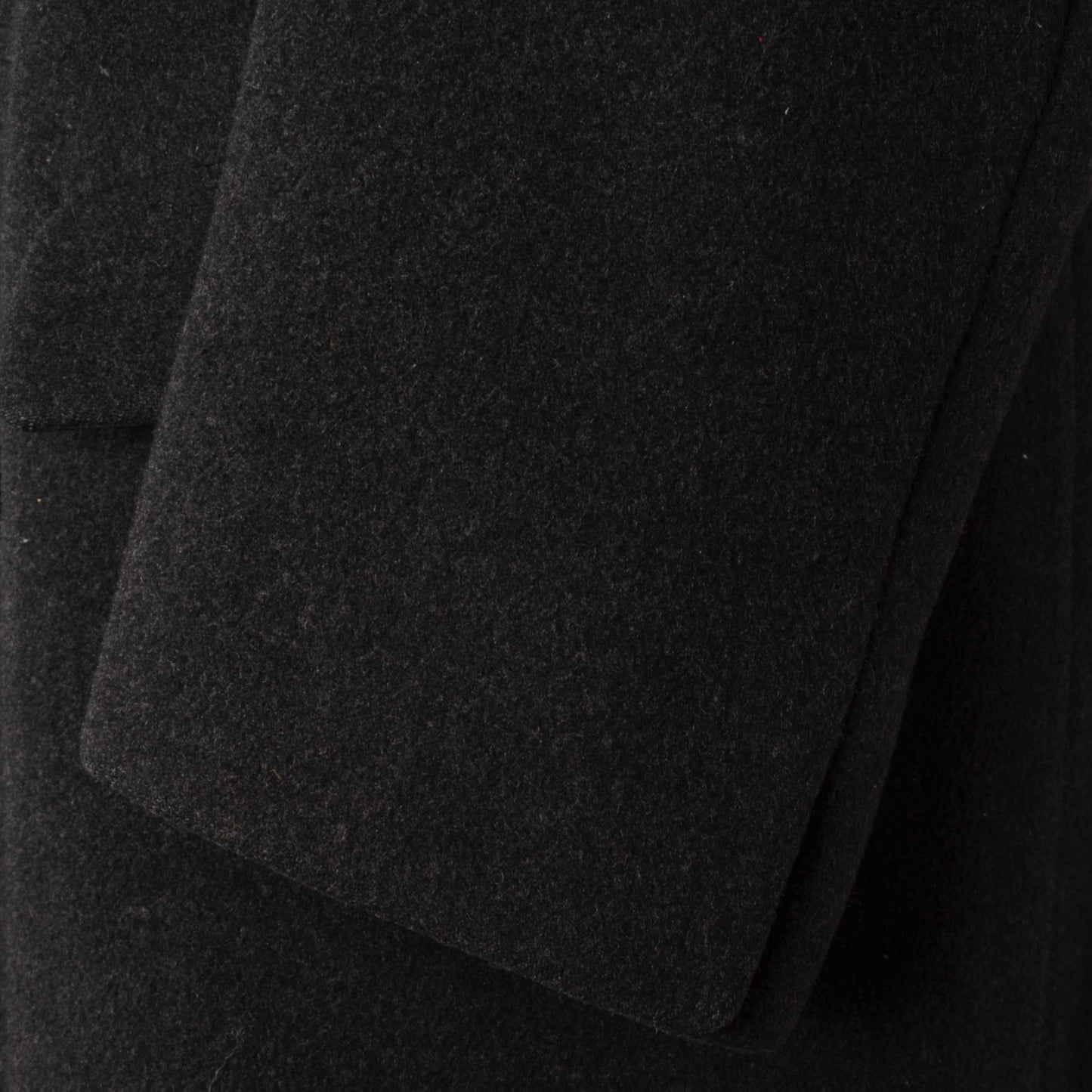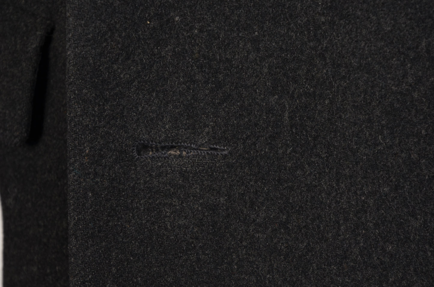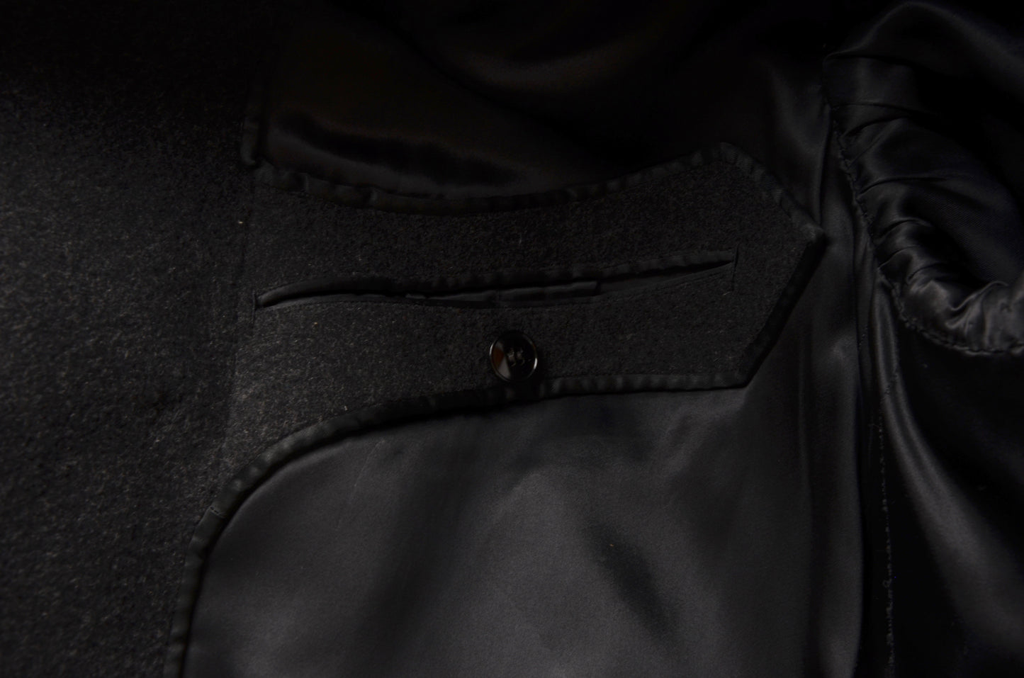 Maßgeschneiderter zweireihiger Mantel von 1940. Anthrazitgrauer Mantel mit schwarzem Astrakan-Kragen. Hergestellt in Österreich.