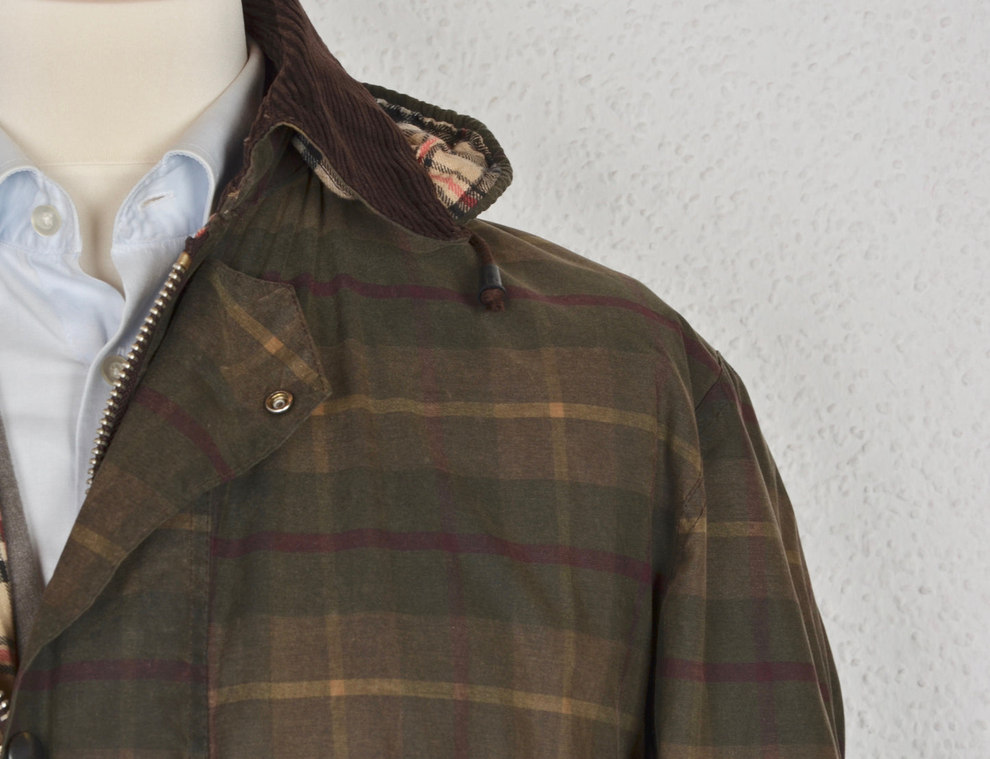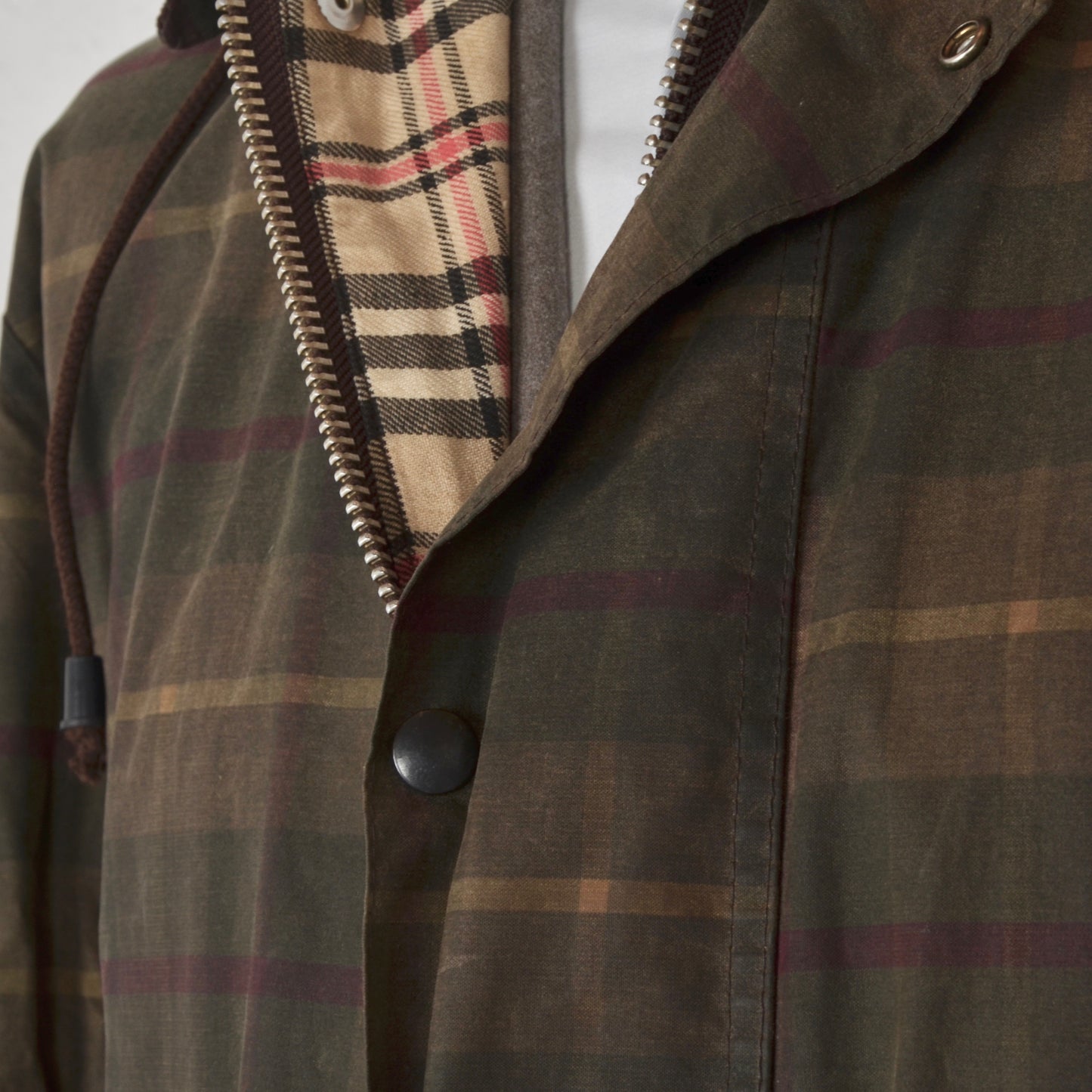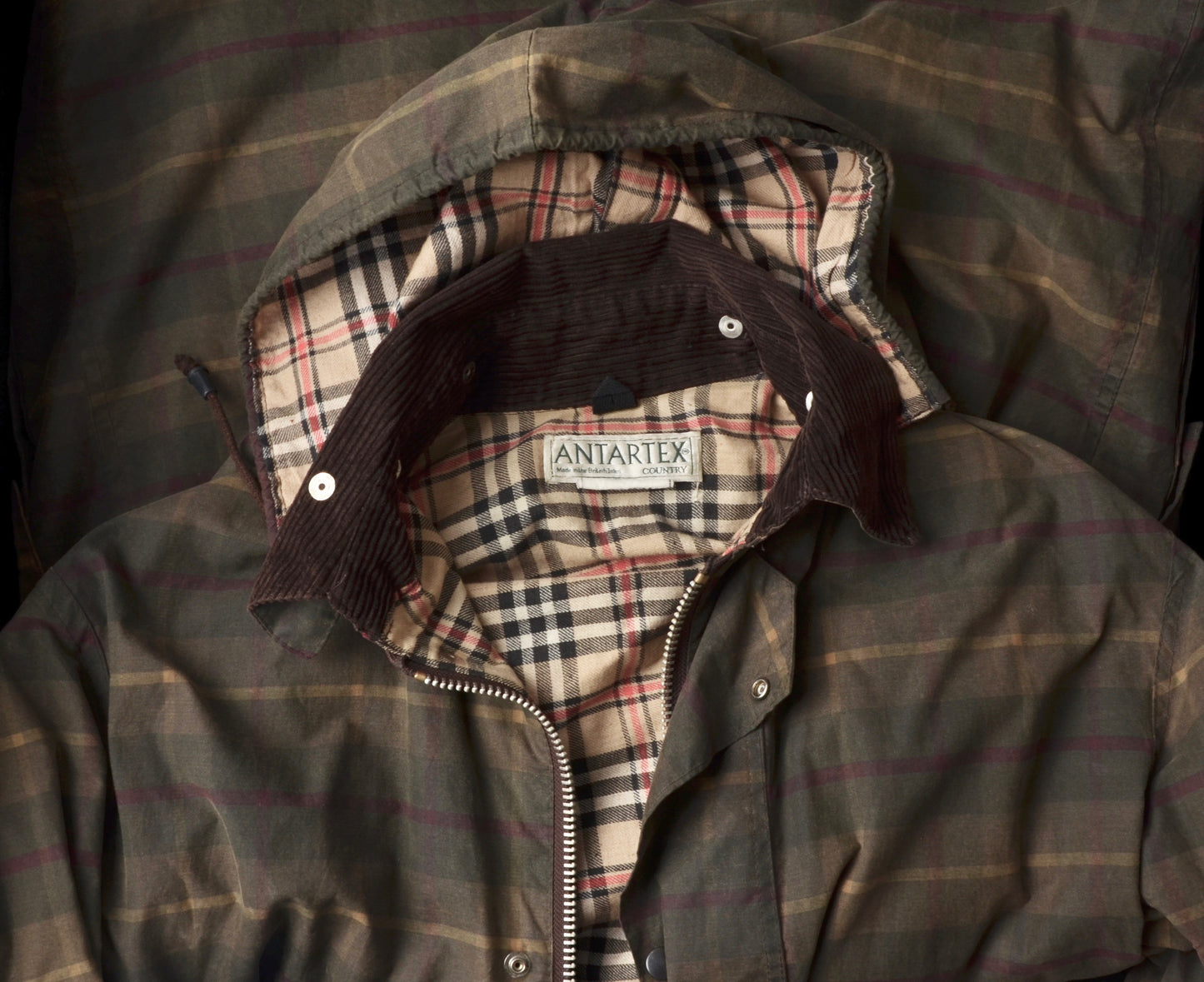Antartex gewachste Jacke in Karo mit abnehmbarer Kapuze. Hergestellt in England aus 100 % Baumwolle.
