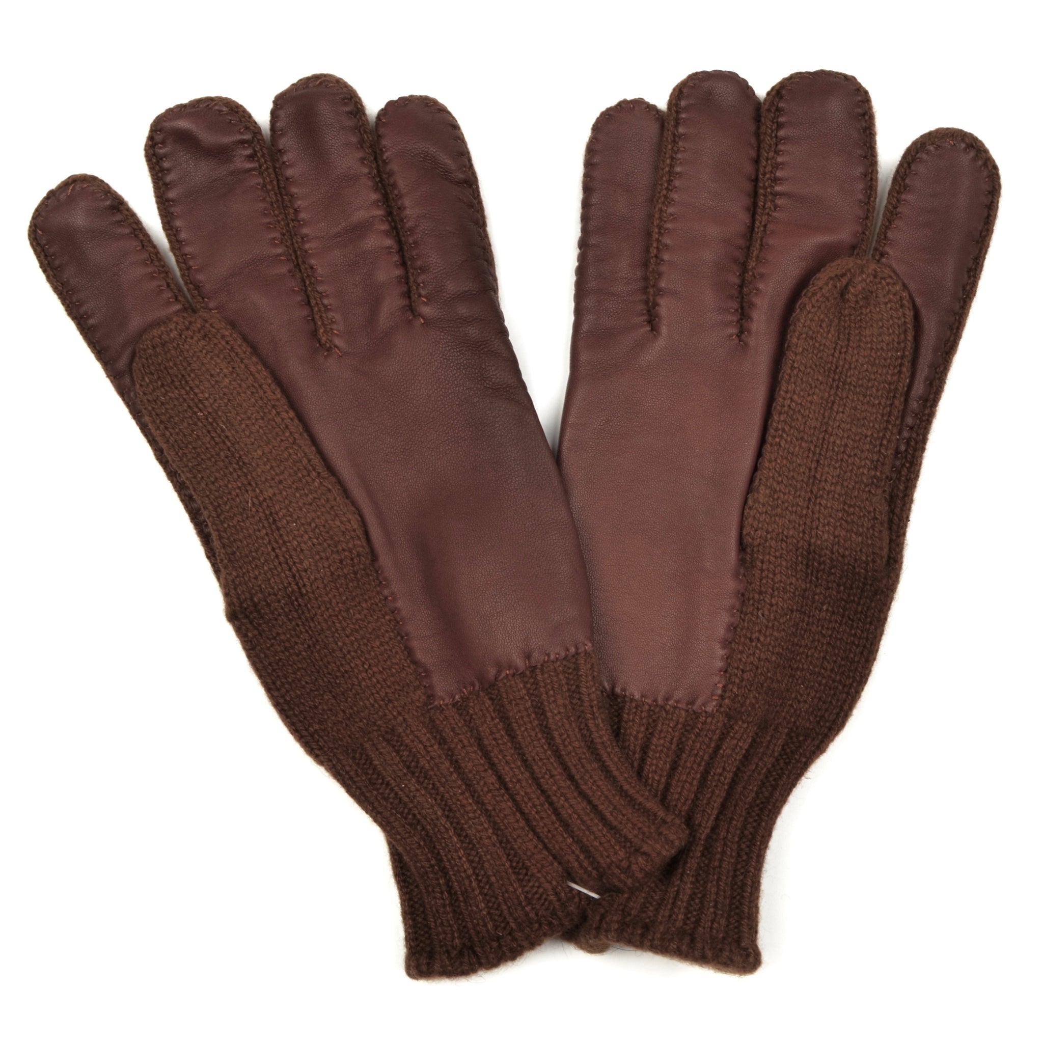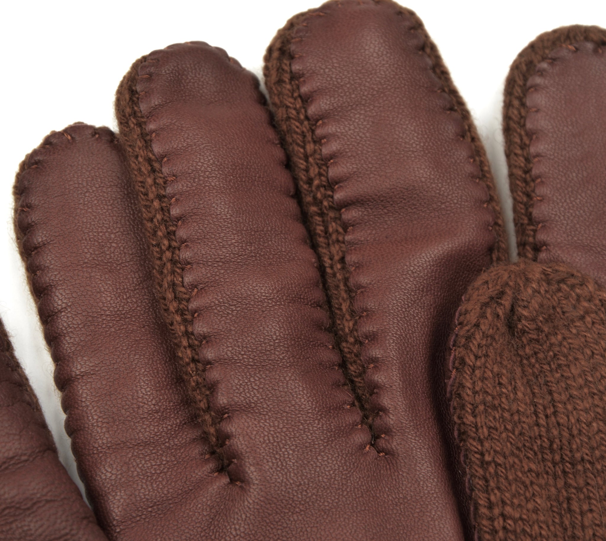 Strickhandschuh aus 100 % Kaschmir, Größe M. Handschuh mit brauner Lederhandfläche. Hergestellt in Schottland.