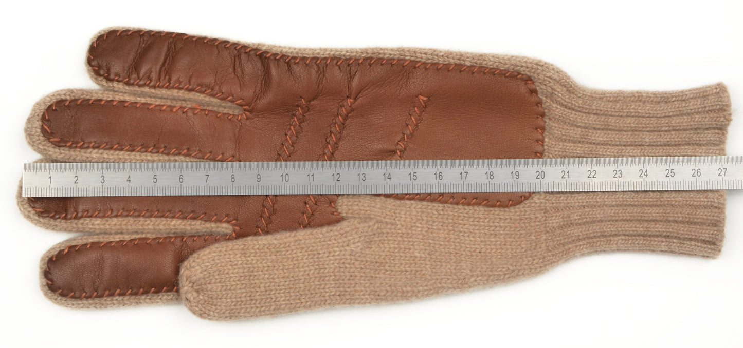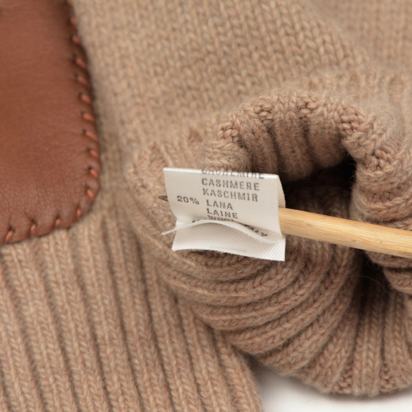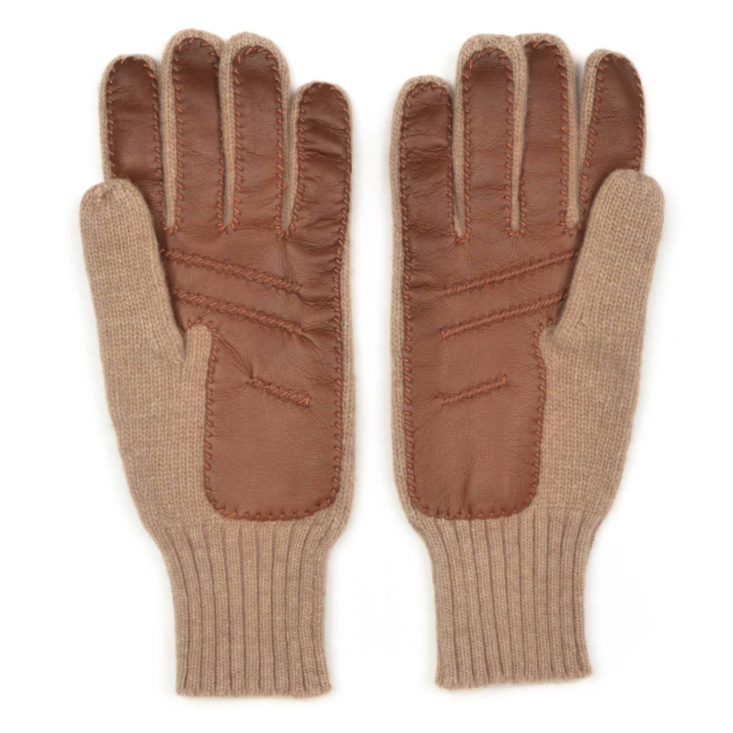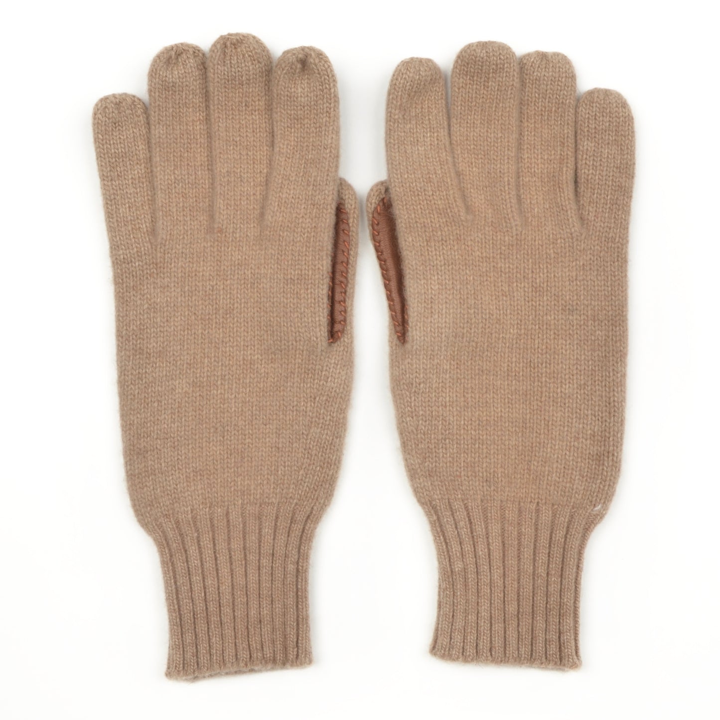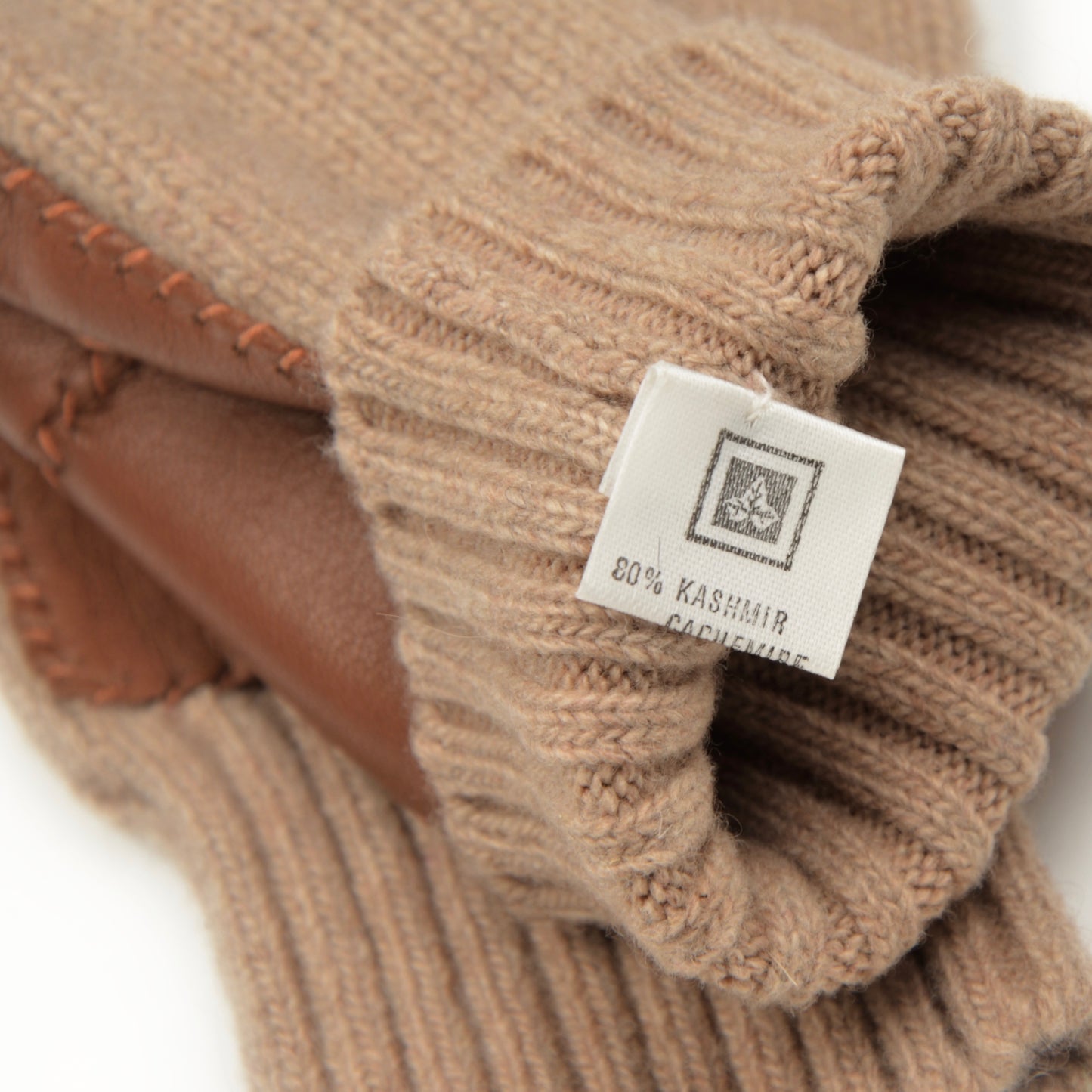 Strickhandschuhe aus 80 % Kaschmir und 20 % Wolle. Die Handschuhe haben hellbraune Lederhandflächen. Kein Größenschild, aber Passform ca. M. Hergestellt in Italien