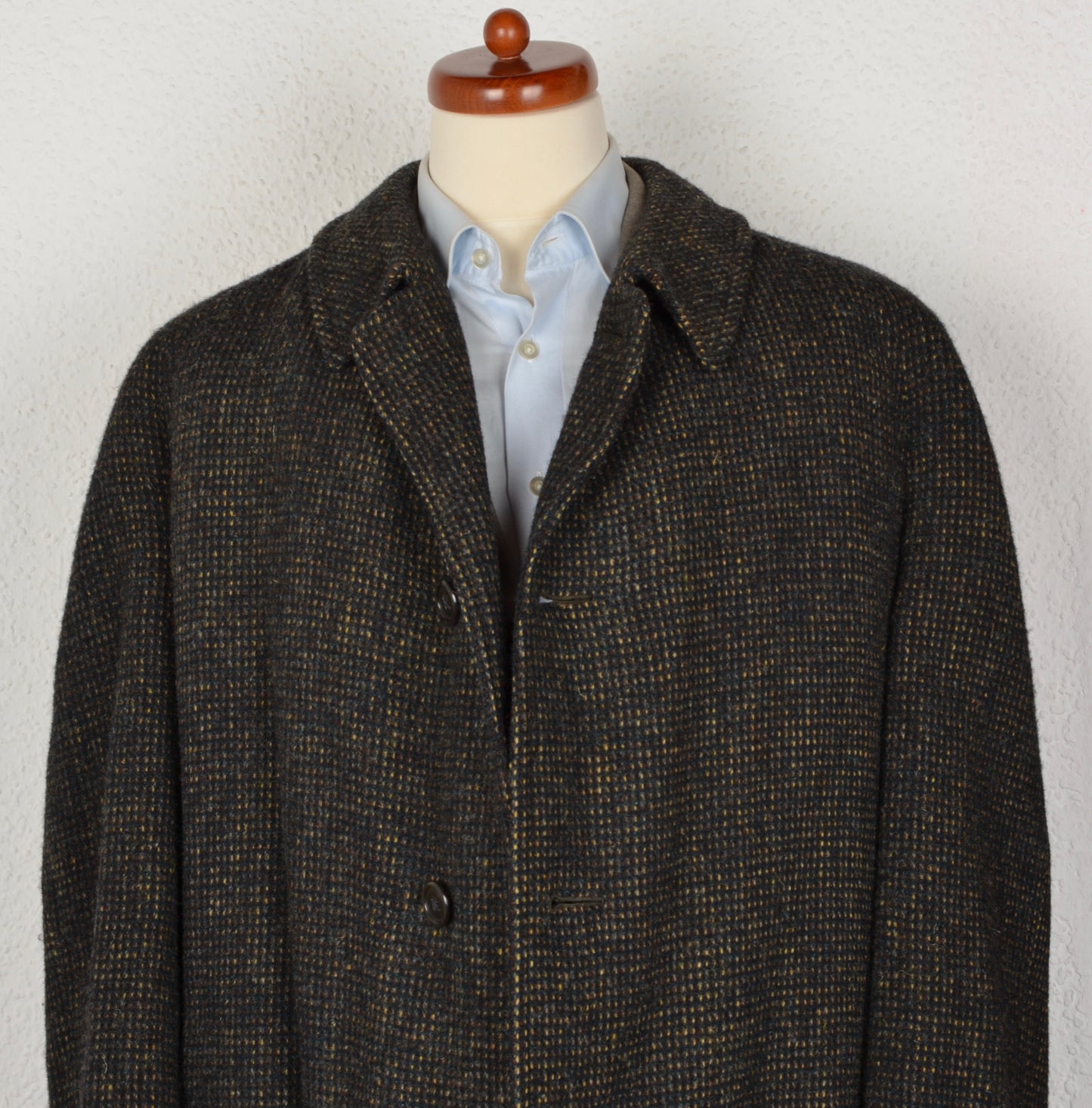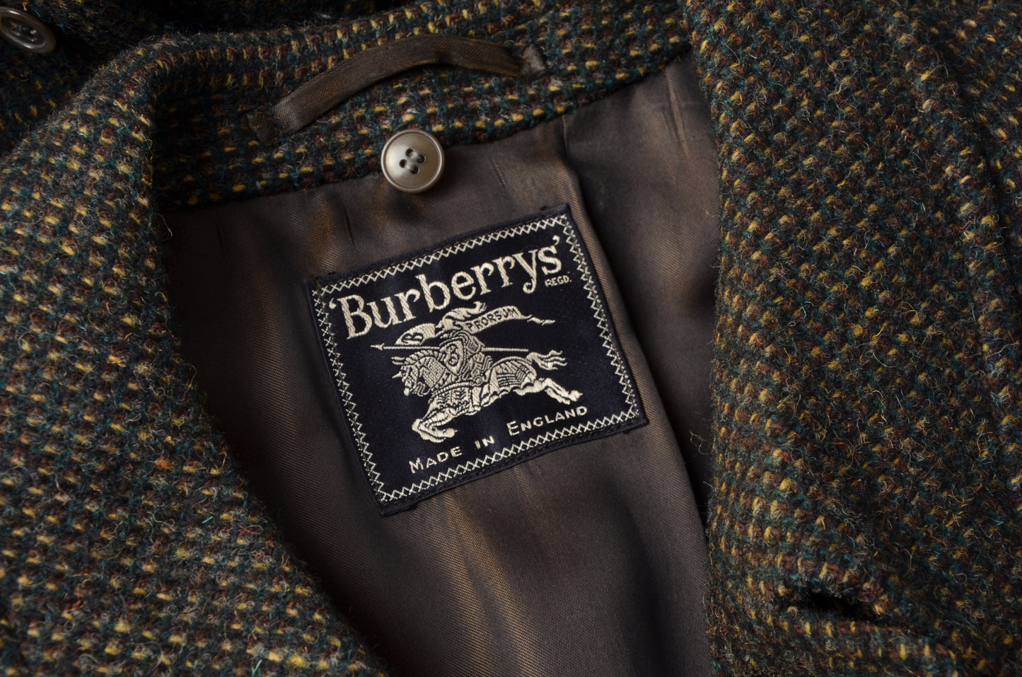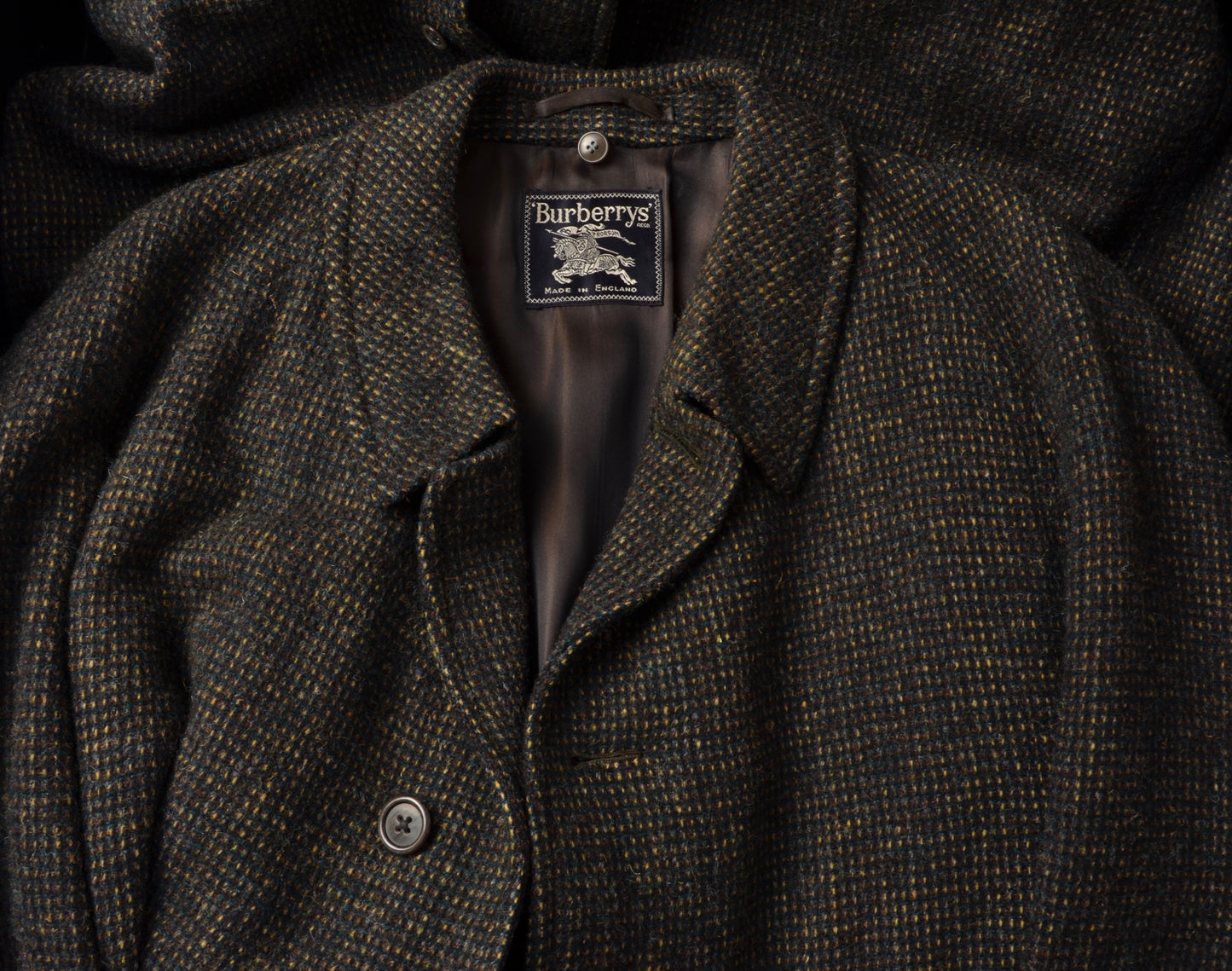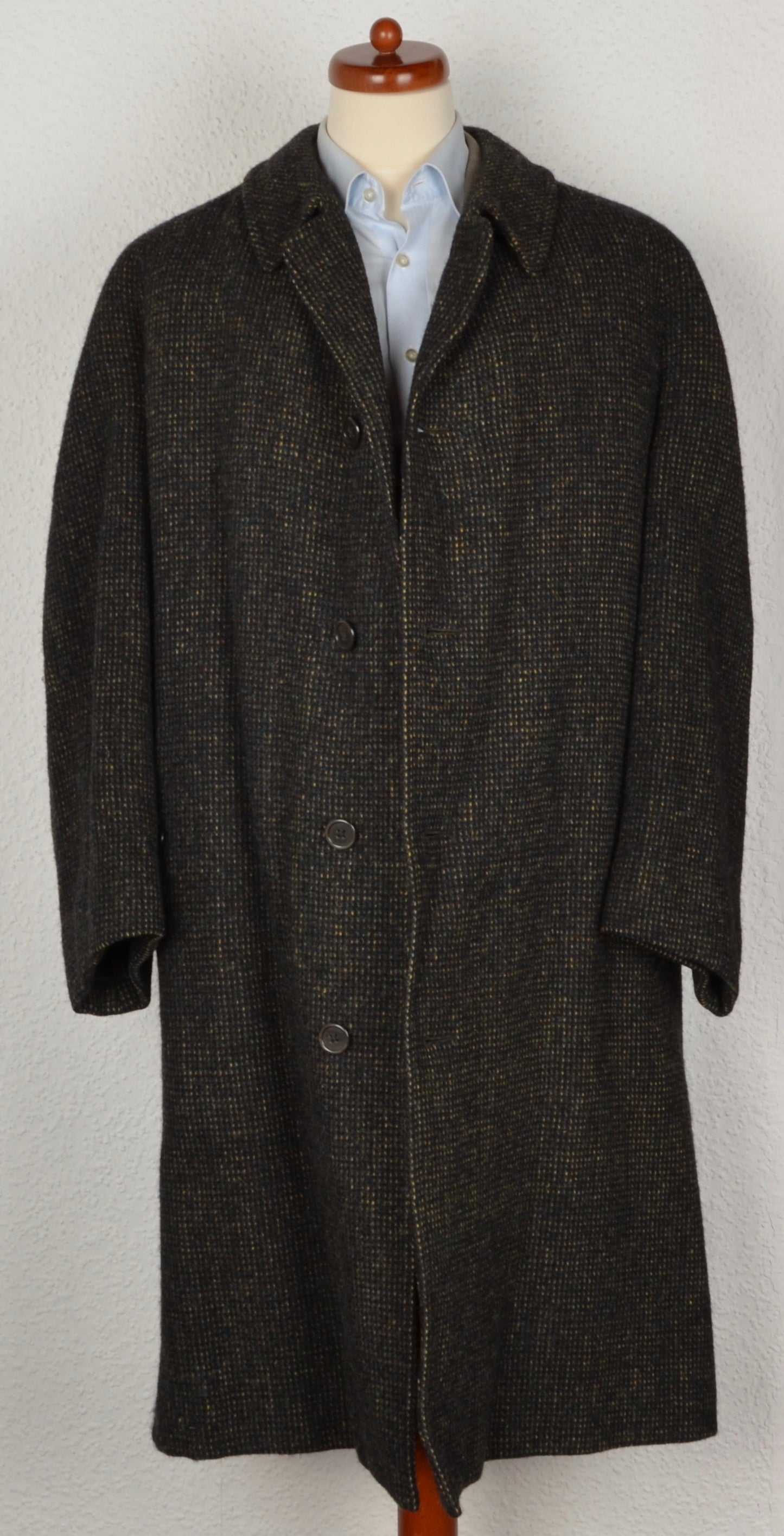 Tweedmantel aus moosgrün meliertem Tweed von Burberrys. Hergestellt in England. Kein Stoffinhaltstag, aber aus Wolle.