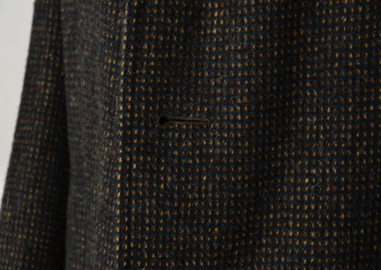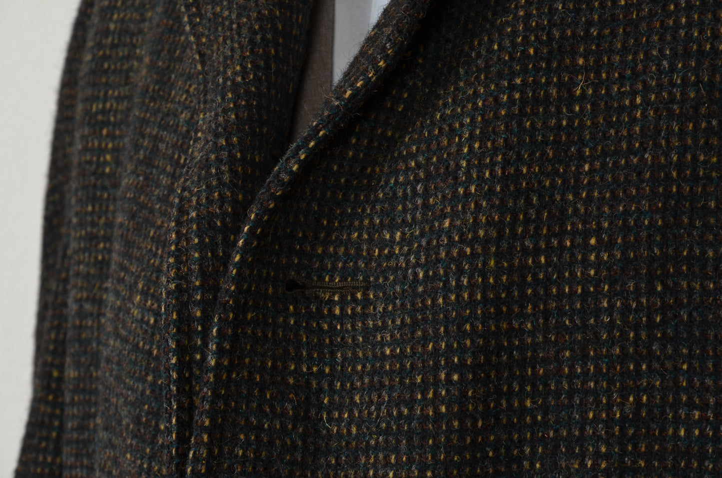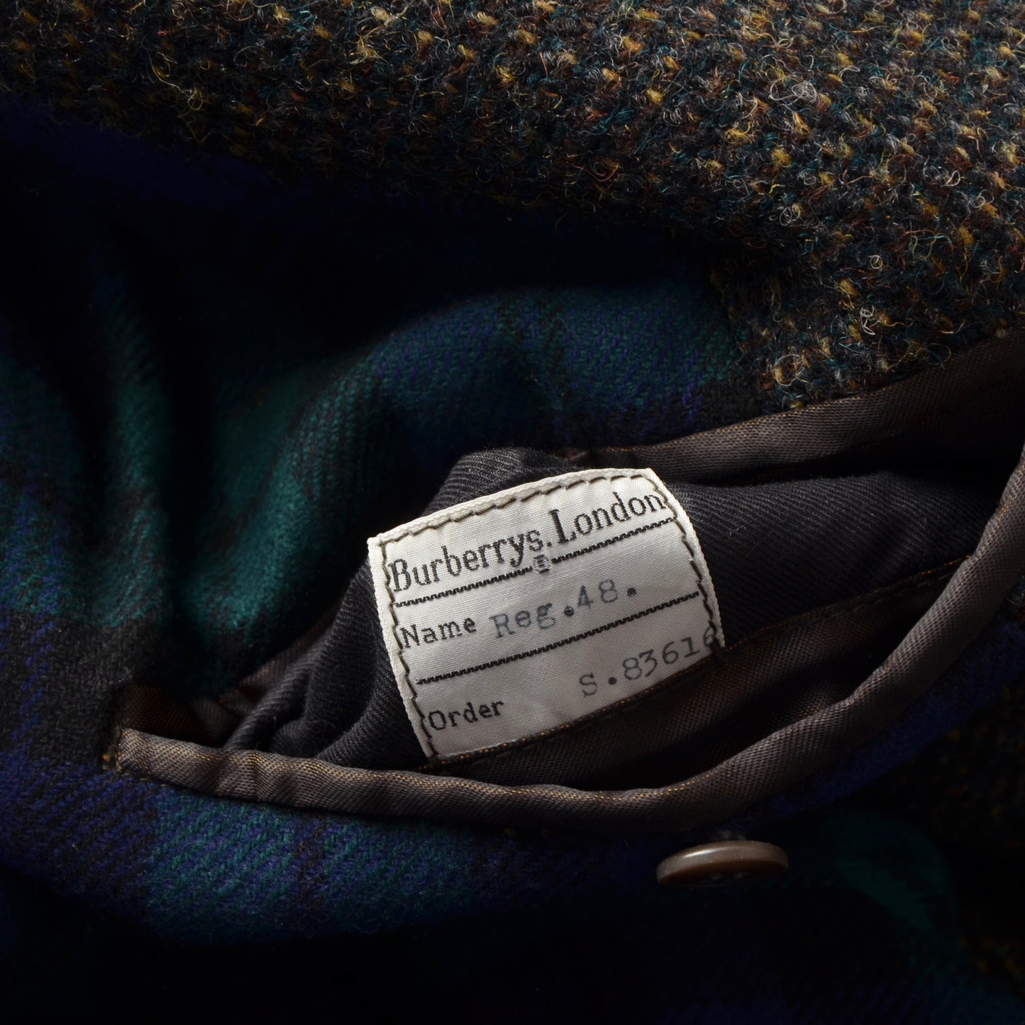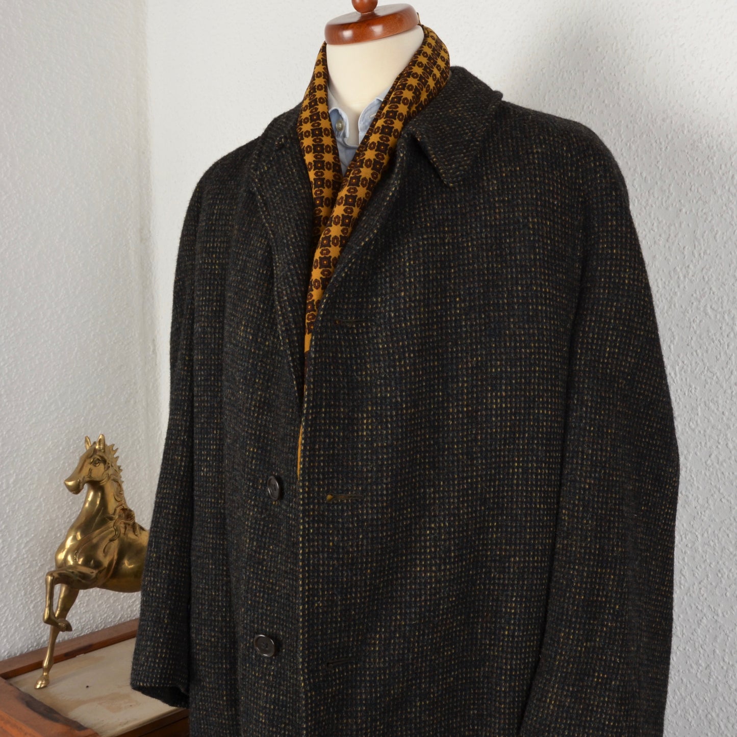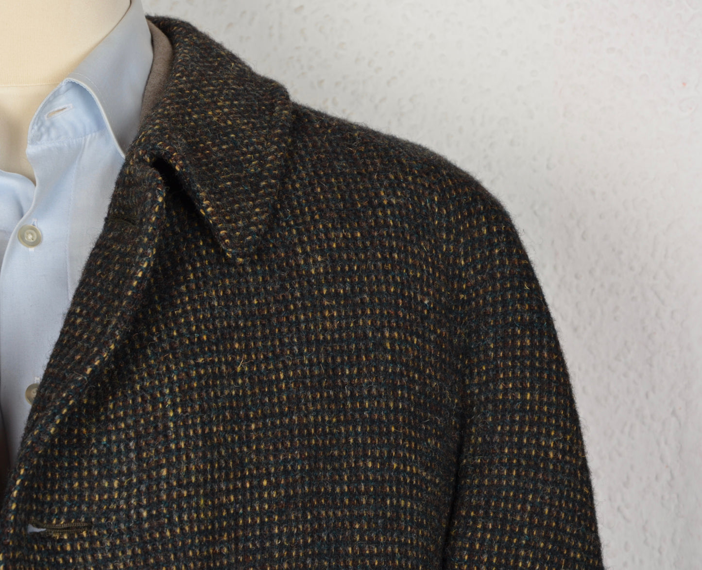 Tweedmantel aus moosgrün meliertem Tweed von Burberrys. Hergestellt in England. Kein Stoffinhaltstag, aber aus Wolle.