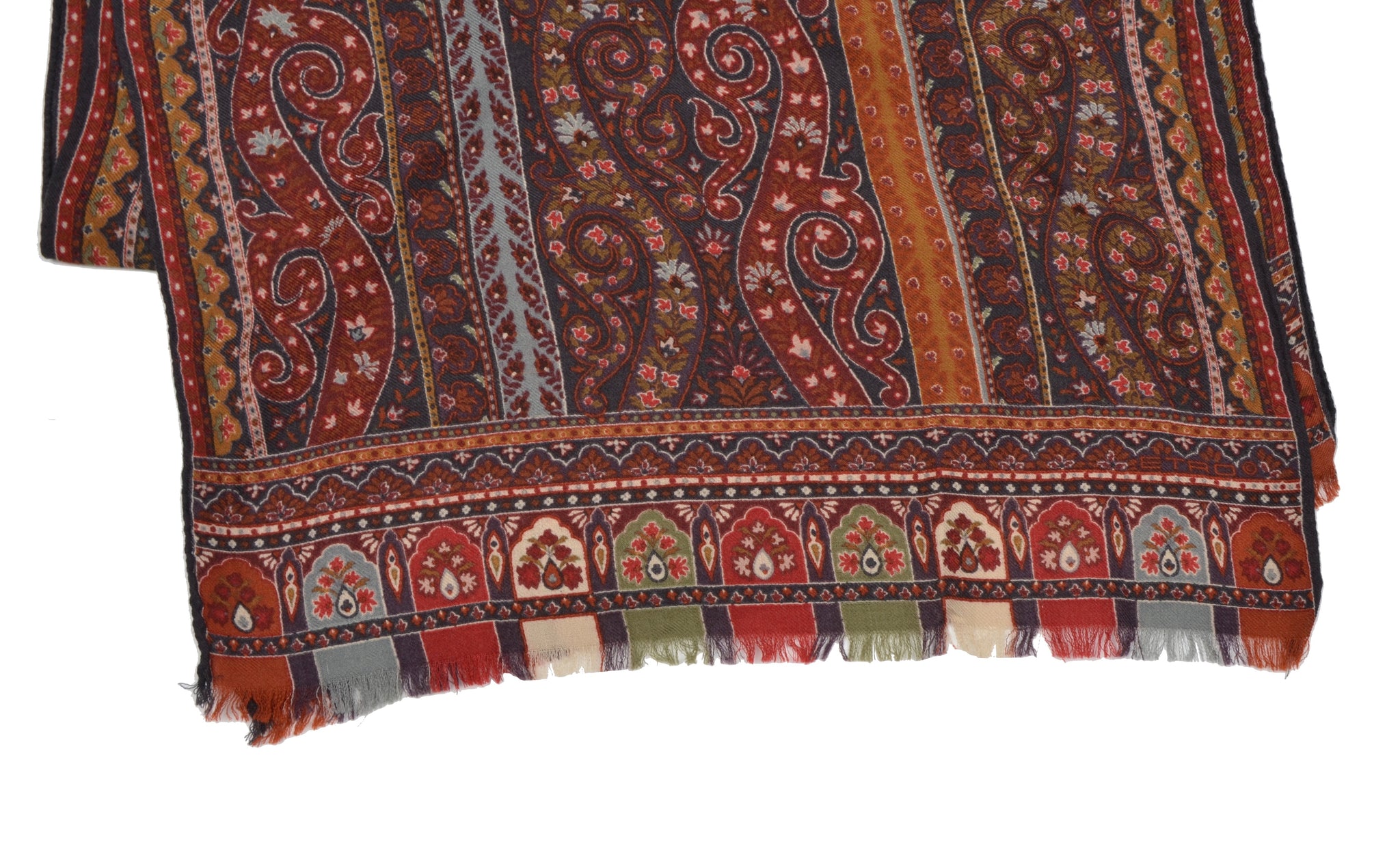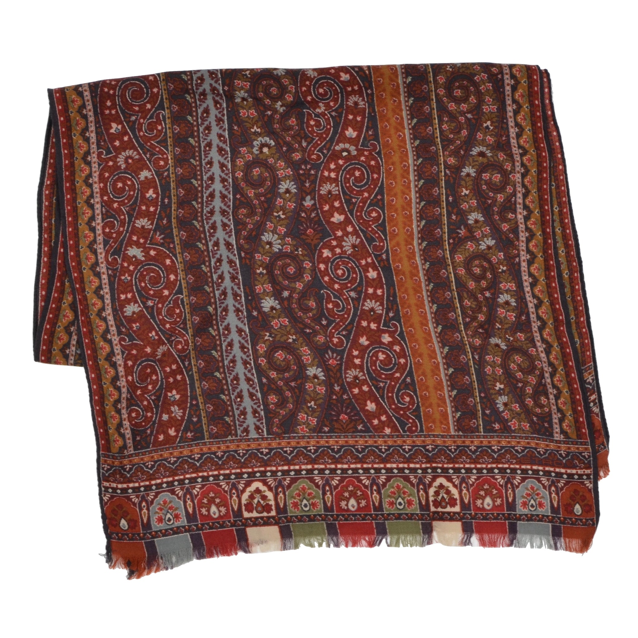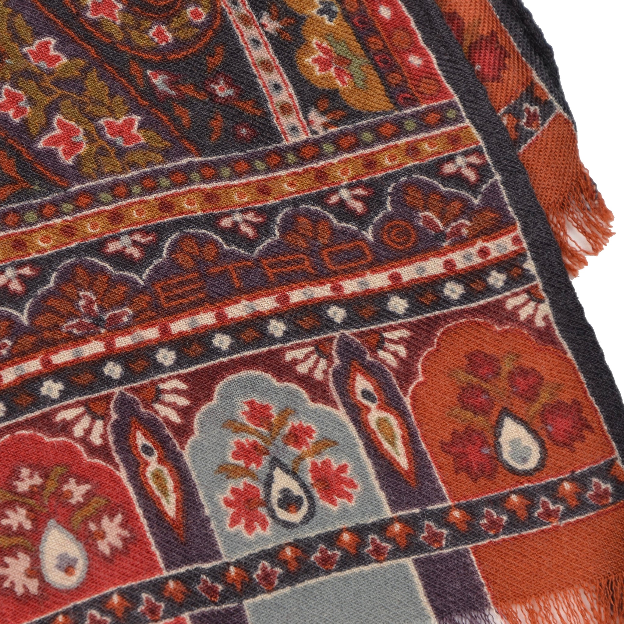Aztekisch inspirierter Schal in Rot-, Orange- und Blautönen von Etro Milano. Kein Stoffetikett, sondern aus Wolle & Seide.