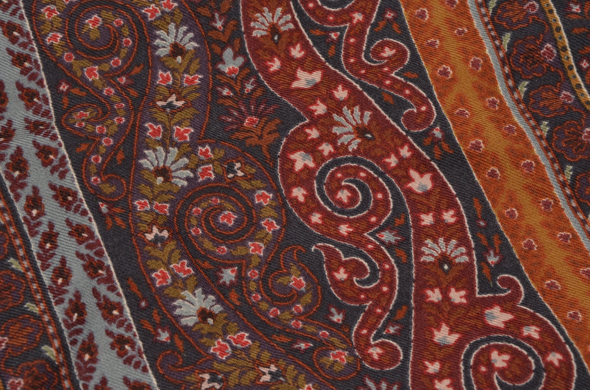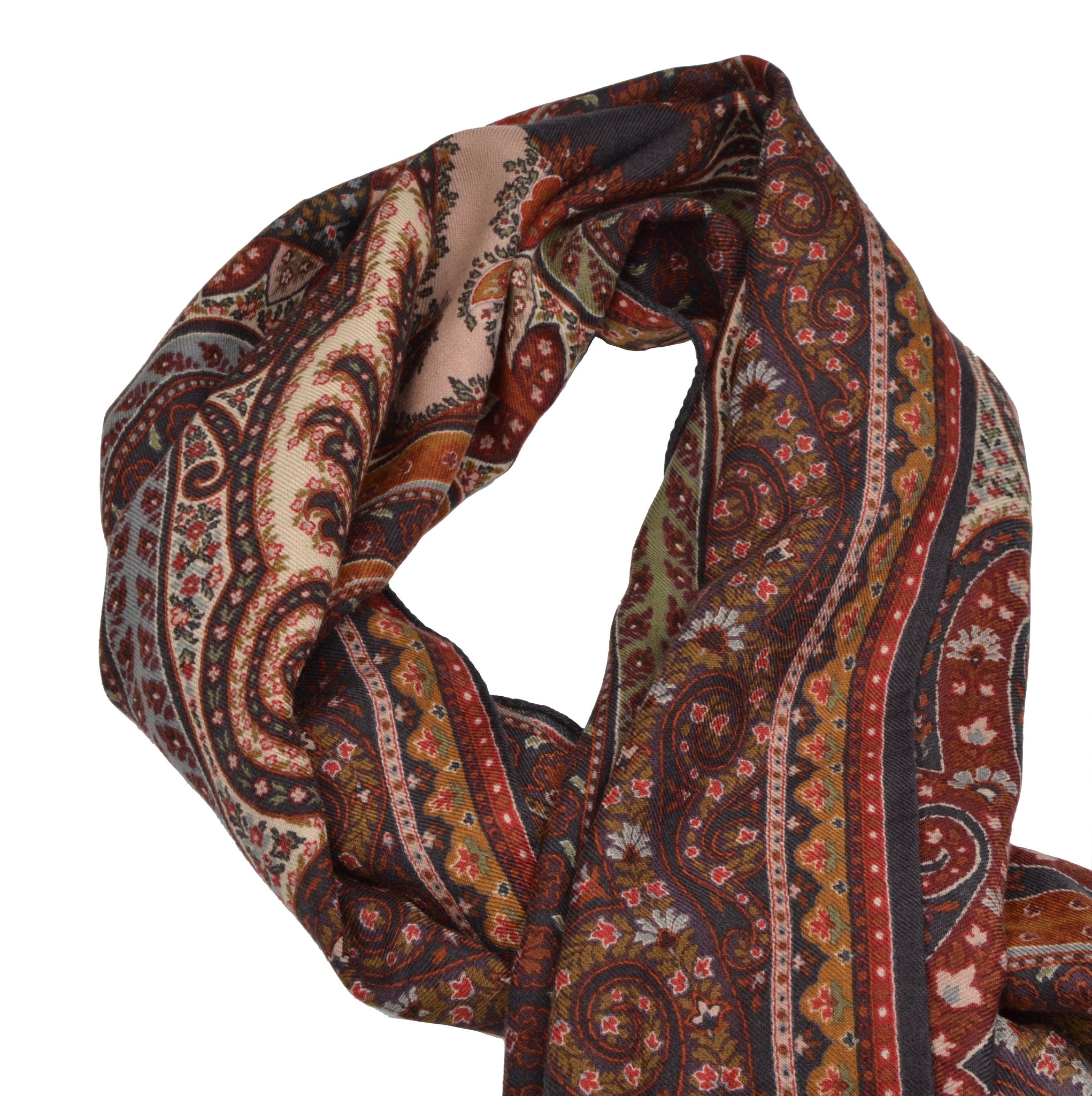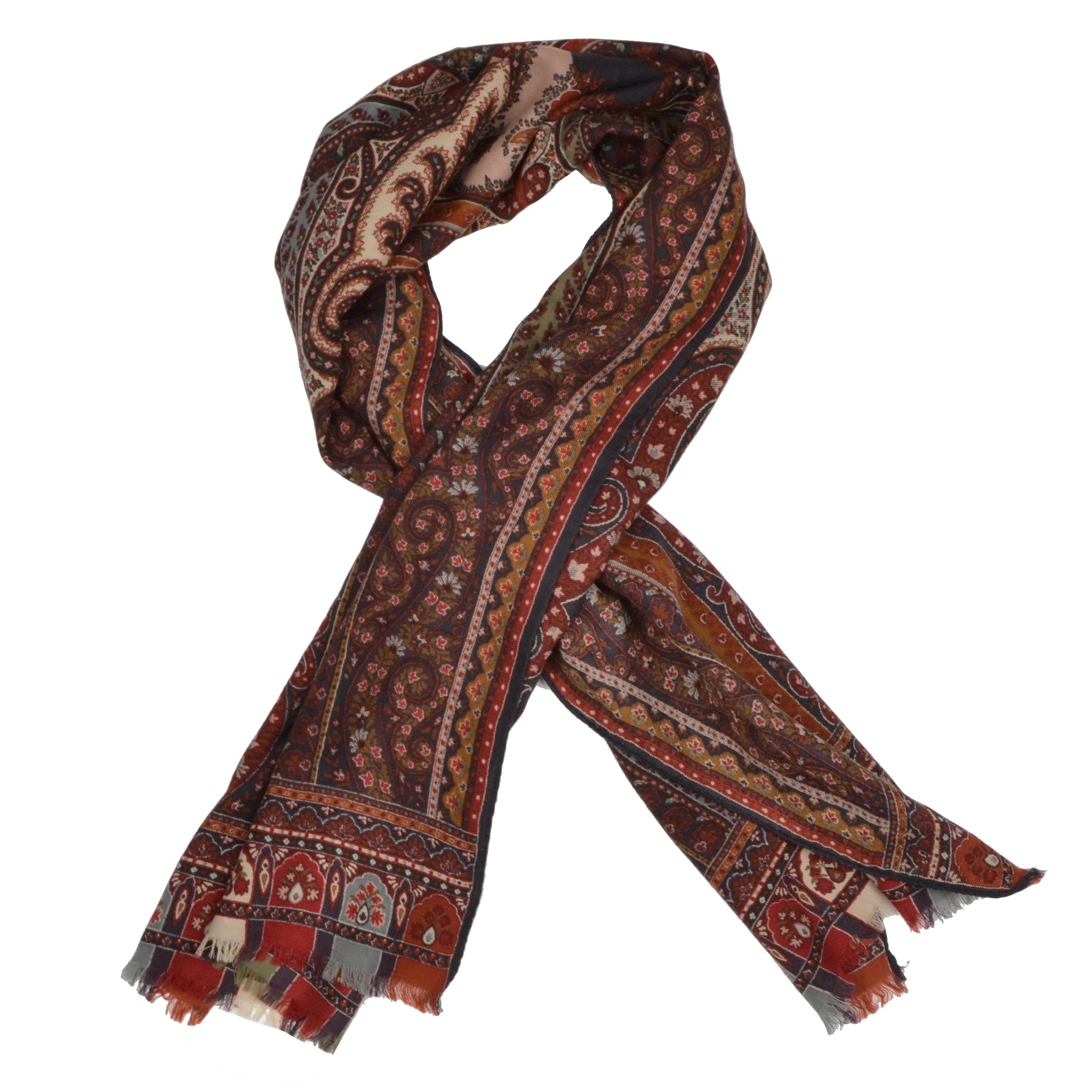 Aztekisch inspirierter Schal in Rot-, Orange- und Blautönen von Etro Milano. Kein Stoffetikett, sondern aus Wolle & Seide.
