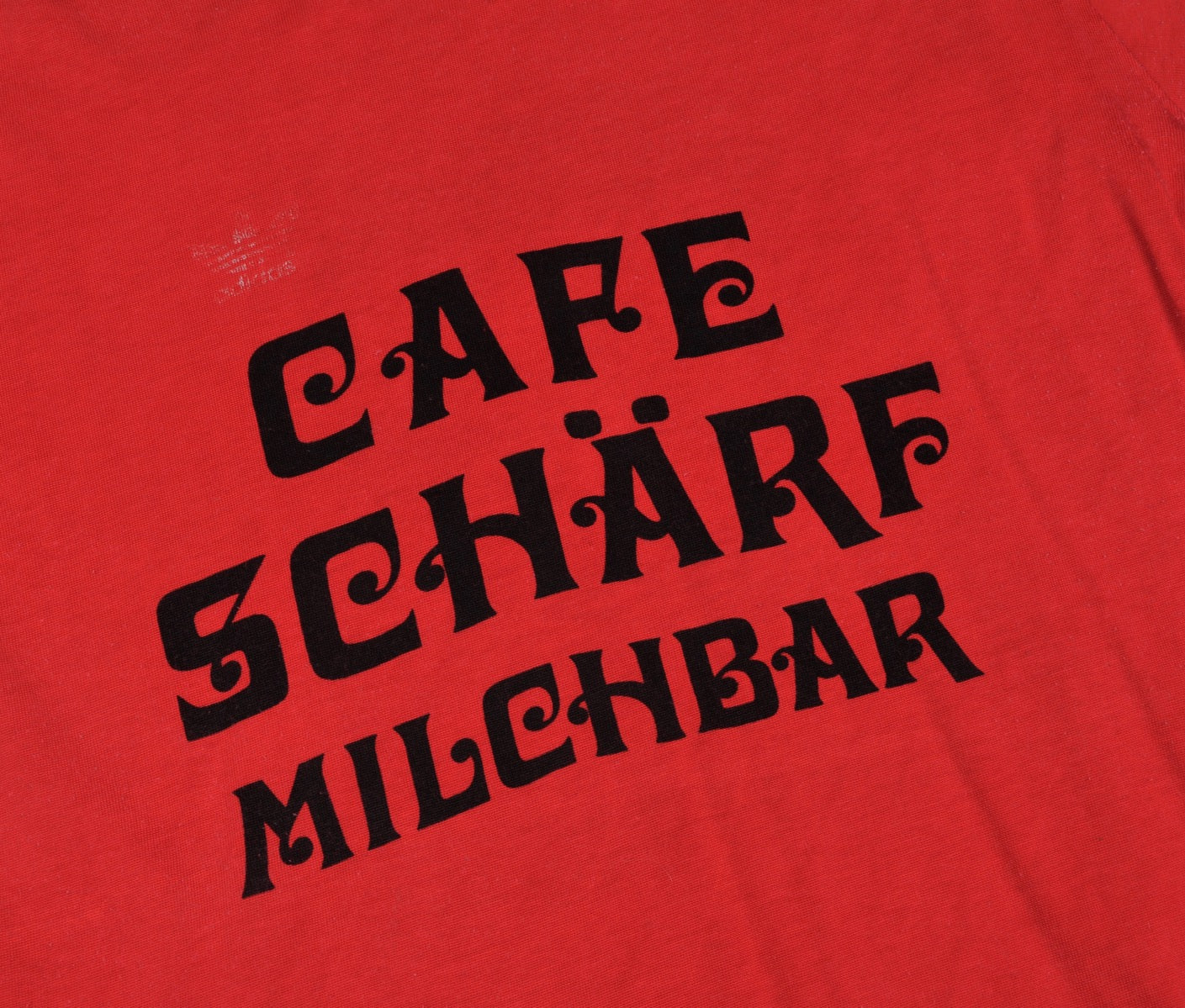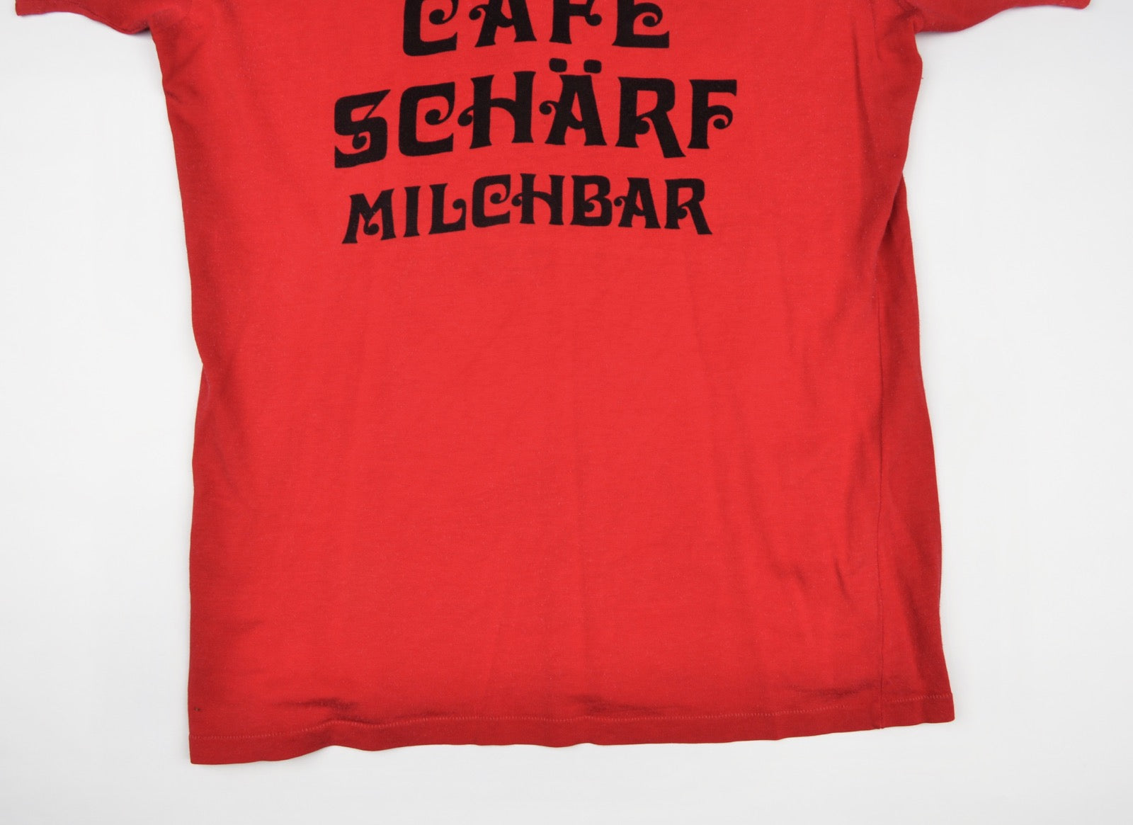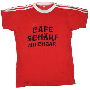Vintage 70er Adidas "Cafe Schärf Milchbar" Trikot, Größe D5-6/M. Hergestellt in Westdeutschland aus 60 % Viskose und 40 % Baumwolle.
