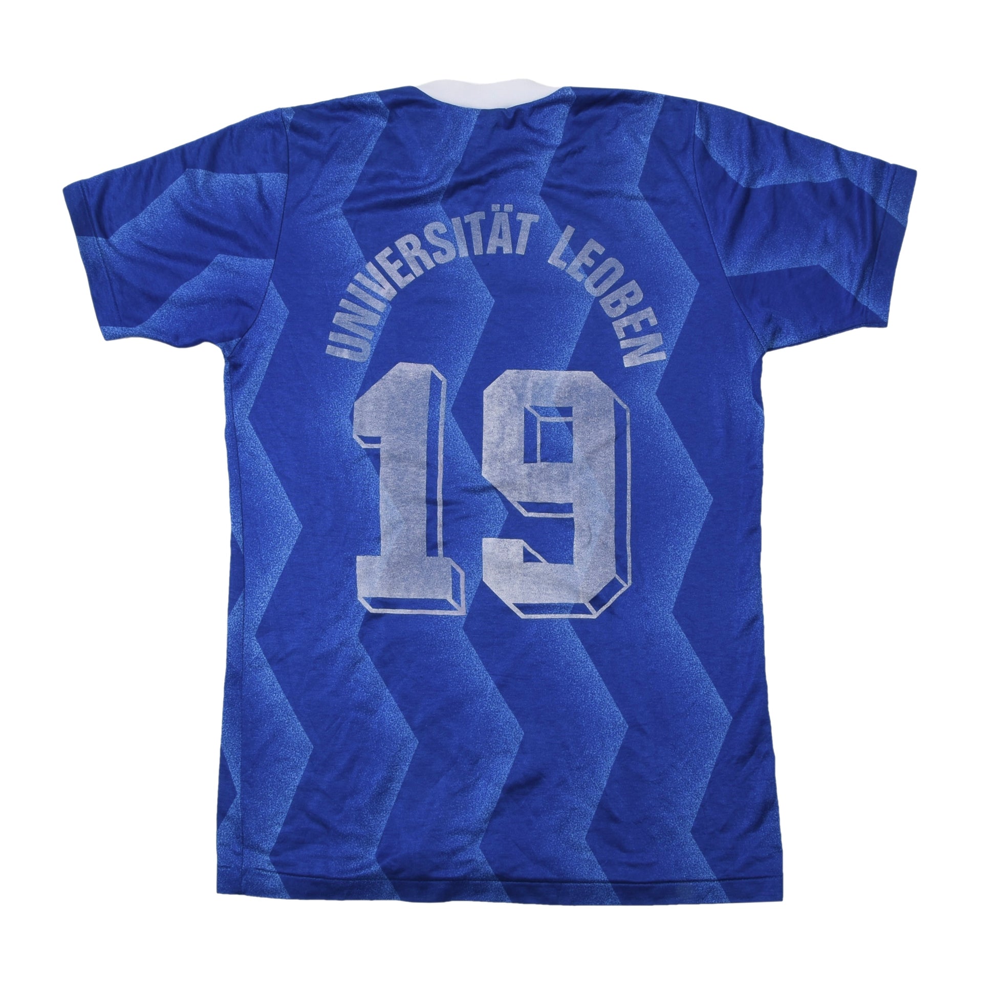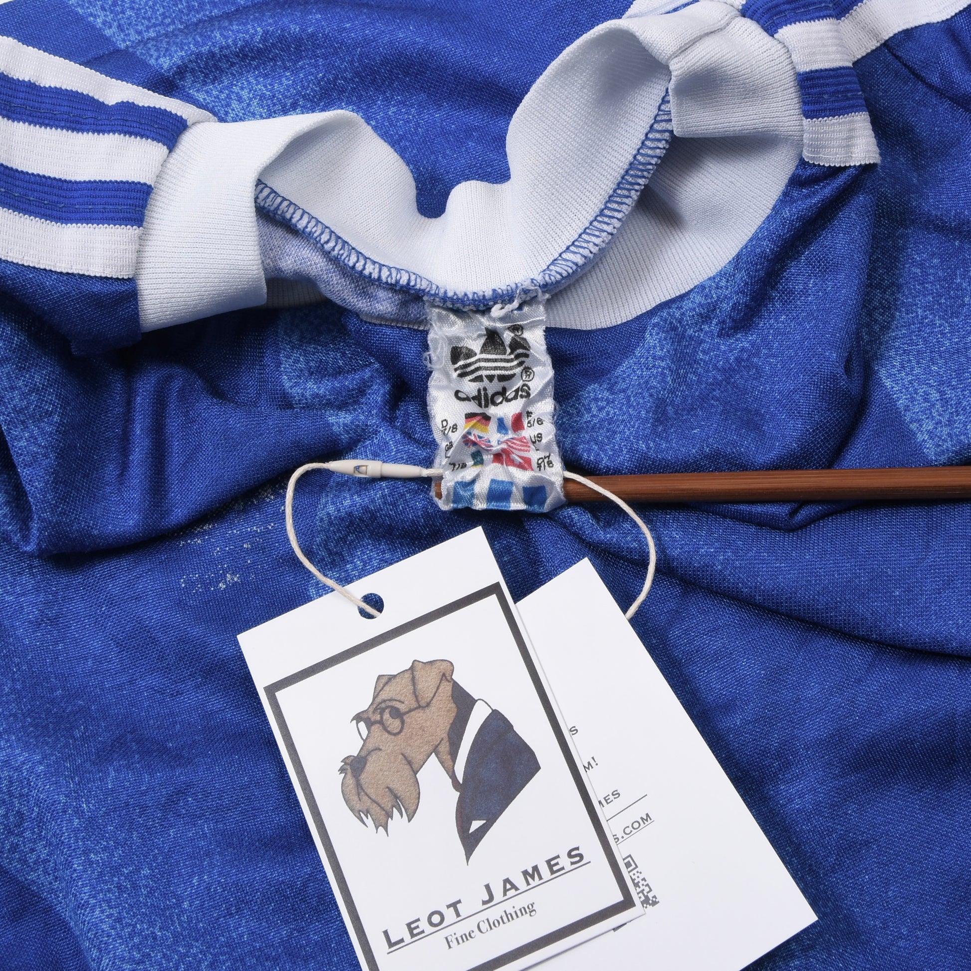Vintage Adidas-Fußballtrikot, Größe D 7/8 (siehe Maße). Hergestellt in Westdeutschland aus 40 % Polyester, 40 % Baumwolle und 20 % Viskose.